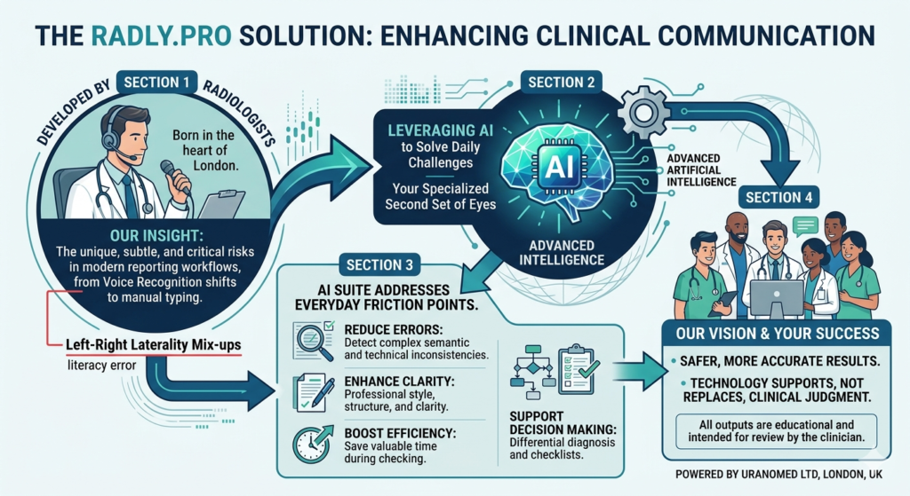 Welcome to Radly.pro, a London-based health-tech platform dedicated to refining the standards of clinical communication. Born in the heart of the UK’s medical and technological hub, our mission is to empower clinicians through intelligent, intuitive tools that enhance the precision of radiology reporting.